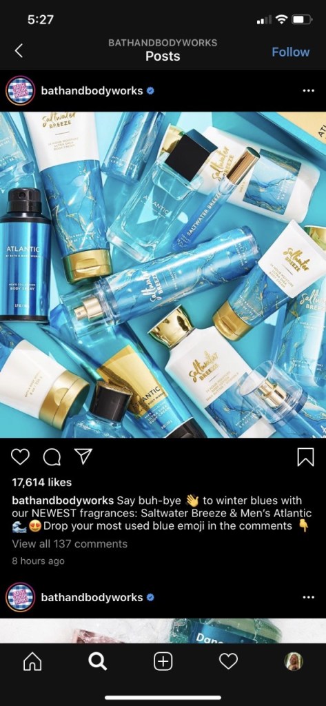 I picked the brand Bath & Body Works for my IMC assignment. I knew they’d be releasing new fragrances for the spring and summer soon, so I looked to their Instagram account first.