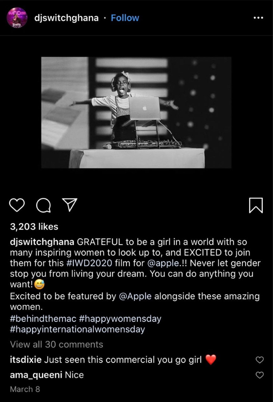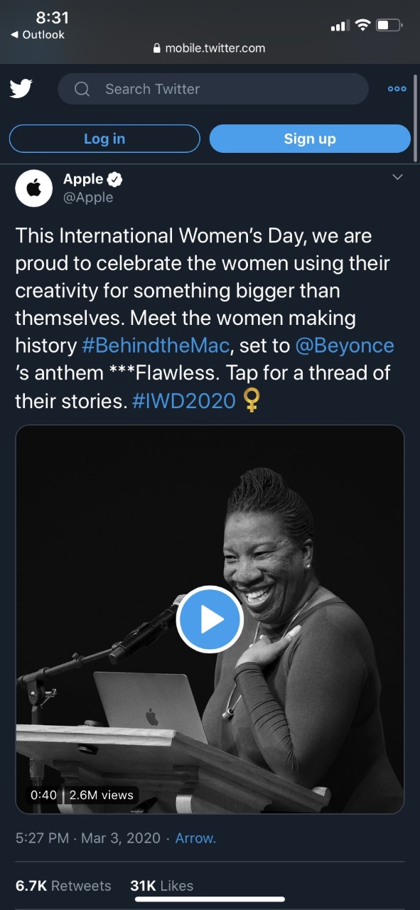 The campaign was integrated on numerous platforms, including but not limited to: Twitter, Snapchat, Instagram, TV and YouTube. The Snapchat ads for International Women’s Day are what caught my attention. The 49-second video that is now on their YouTube channel was split into 10-second portions on Snapchat in a ‘story’ form for viewers to click on. It felt like a video instead of an ad, which Apple made a point in doing so that viewers would watch it all the way through, like I did. Their tweet for the International Women’s Day video was retweeted 6.7 thousand times and liked by 31,000 Twitter users. It’s not the biggest number of shares, but it definitely stood out on a platform that produces a huge amount of content in just one hour. The YouTube video for the International Women’s Day video has been viewed over 27 million times. Despite its massive reach on Twitter and YouTube, the campaign could be integrated and promoted on more social media sites and platforms. In doing this, the campaign would be even more successful.